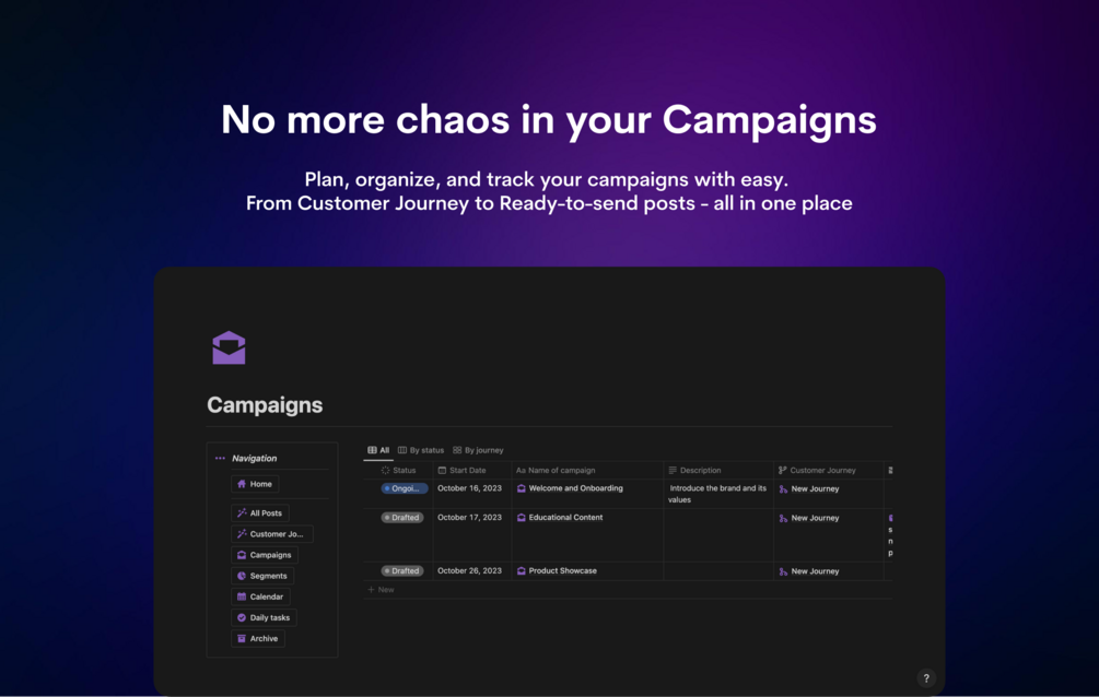 Simplified Consistency: Bid farewell to campaign chaos. Our Studio simplifies campaign planning, organization, and tracking, providing you with a seamless process from mapping out a customer journey to preparing posts, all in one location.
