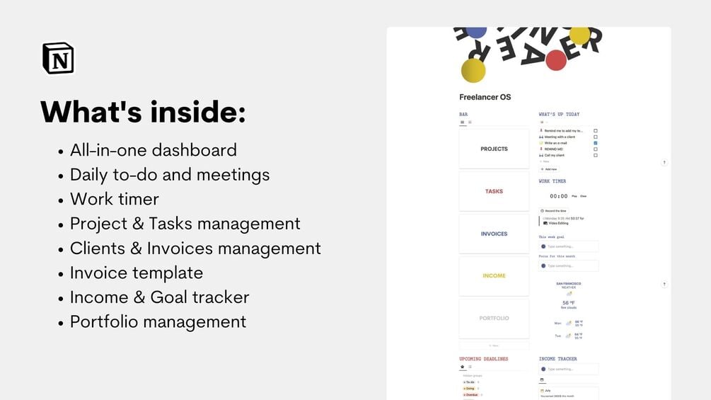 This template included has its own set of systems and databases to help you be more productive as a freelancer or solopreneur: All-in-one Dashboard, Project & Tasks Management, Income Tracker, Clients & Invoices management system, Portfolio management. -
